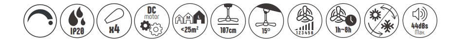 El ventilador de techo Odiel combina elegancia y funcionalidad. Este ventilador decorativo con luz led cuenta con 4 aspas y 107cm de diámetro con las aspas abiertas que incorpora un motor DC ultra silencioso de 36W y 6 velocidades. Función verano e invierno. Programable entre 1h y 8h. El modelo Odiel es un ventilador de techo decorativo con luz LED integrada de 54W y 5300lm. Con diseño elegante y moderno, esta lámpara ventilador es ideal para estancias grandes de más de 25m2. Con cuerpo en acero y plástico ABS, pintado en blanco. Difusor acrílico. Con mando incluido.